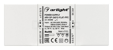 Источник напряжения с гальванической развязкой для светодиодных изделий. Входное напряжение 220-240 VAC. Выходные параметры: 24 В, 0.5 А, 12 Вт. Встроенный PFC >0.9. Сверхтонкий пластиковый корпус IP20. Габаритные размеры длина 112 мм, ширина 46 мм, высота 15.5 мм. Гарантийный срок 5 лет.
