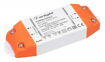 Источник напряжения с гальванической развязкой для светодиодных изделий. Входное напряжение 220-240 VAC. Выходные параметры: 24 В, 0.83 А, 20 Вт. Встроенный PFC >0.9. Негерметичный пластиковый корпус IP 20. Габаритные размеры длина 123 мм, ширина 44,6 мм, высота 19,2 мм. Гарантийный срок 5 лет.