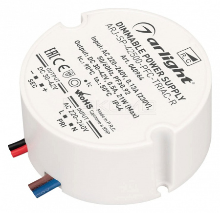 Диммируемый источник тока по стандарту TRIAC с гальванической развязкой для светильников и мощных светодиодов. Входное напряжение 220-240 VAC. Выходные параметры: 30-42 В, 500 mА, 21 Вт. Встроенный PFC >0,92. Негерметичный пластиковый корпус IP 44. Габаритные размеры диаметр в окружности Ø57 мм, высота 26 мм. Гарантийный срок 5 лет.