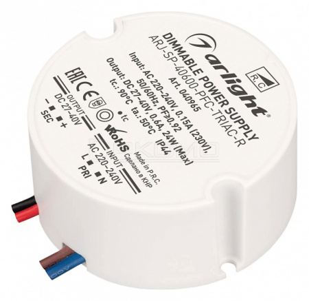 Диммируемый источник тока по стандарту TRIAC с гальванической развязкой для светильников и мощных светодиодов. Входное напряжение 220-240 VAC. Выходные параметры: 27-40 В, 600 mА, 24 Вт. Встроенный PFC >0,92. Негерметичный пластиковый корпус IP 44. Габаритные размеры диаметр в окружности Ø57 мм, высота 26 мм. Гарантийный срок 5 лет.