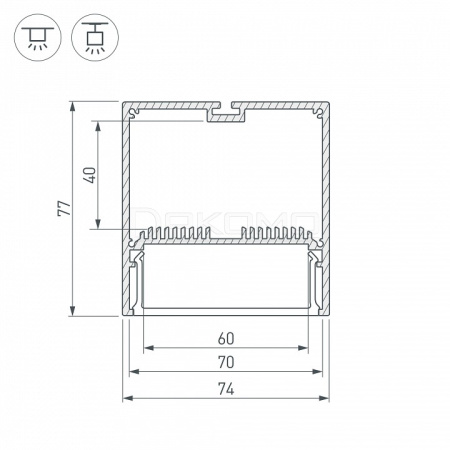 Подвесной/накладной профиль 74x77 мм для линейных светильников. Анодированный алюминий. Отсек для БП 70х40мм. Длина 2000мм. Цена за 1м. Экраны, заглушки отдельно.