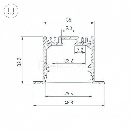 Алюминиевый анодированный профиль для светодиодных лент и линеек. Паз для установки 35 мм. Ширина площадки для ленты 23 мм. Экраны, заглушки и другие аксессуары приобретаются отдельно.