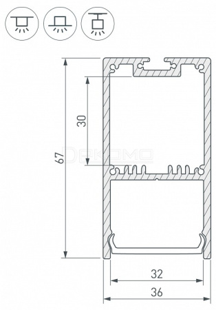 Алюминиевый анодированный профиль для светодиодных лент и линеек. Ширина площадки для ленты 32 мм. Отсек для БП 30х32мм. Экраны, заглушки и другие аксессуары приобретаются отдельно.