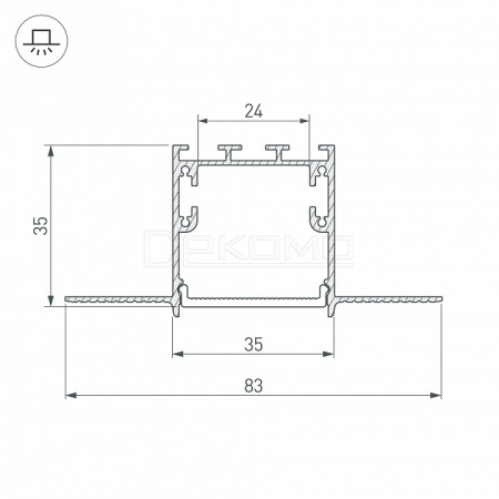 Встраиваемый в гипсокартон, под строительную отделку. Алюминиевый анодированный профиль для светодиодных лент и линеек. Паз для установки 35х35 мм. Экраны, заглушки и другие аксессуары приобретаются отдельно.