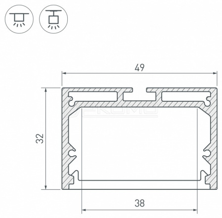 Алюминиевый анодированный профиль для светодиодных лент и линеек. Ширина площадки для ленты 38 мм. Экраны, заглушки и другие аксессуары приобретаются отдельно.