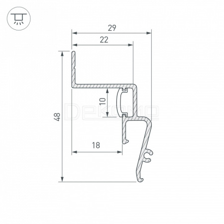 Для контурной подсветки натяжного потолка «Парящий потолок». Минимальное расстояние между поверхностью и натяжным потолком (минимальная высота опуска потолка) - 49 мм. Рекомендуемый шаг крепления профиля - 100-120мм. Соединение профилей между собой с помощью штифтов (гвоздей) 2,5 мм. Для светодиодных лент шириной 8-10 мм.