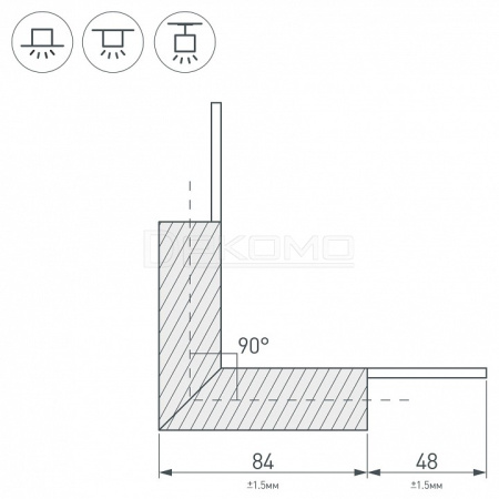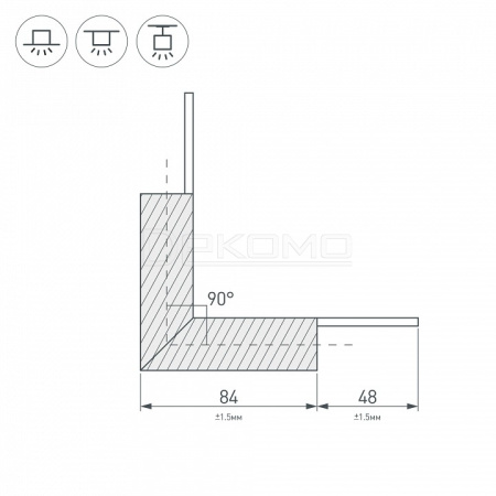 Внутренний угол в сборе, для соединения 2-х профилей PLS-LOCK-H25 под прямым углом 90°. Экран образует линию внутри угла. В комплекте матовый экран (арт.019189), соединители.