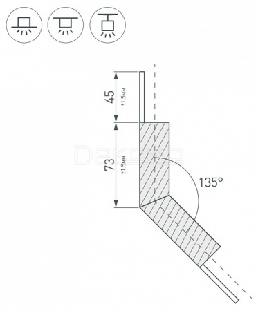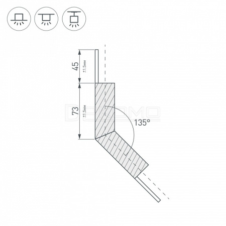 Внешний угол в сборе, для соединения 2-х профилей PLS-LOCK-H25 под углом 135°. Экран образует линию по внешней стороне угла. В комплекте матовый экран (арт.019189), соединители.