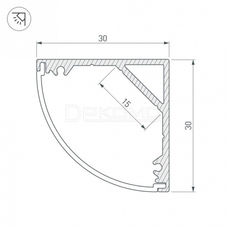 Комплект с круглым экраном, в картонной коробке. Алюминиевый анодированный угловой профиль для светодиодных лент и линеек.Ширина площадки для ленты 15 мм.