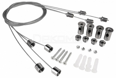 - трос стальной 1 м - 4 шт, узел крепления к потолку - 4 шт., втулка регулировочная с крепежом - 4 шт, дюбель пластиковый - 4 шт., саморез - 4 шт.
