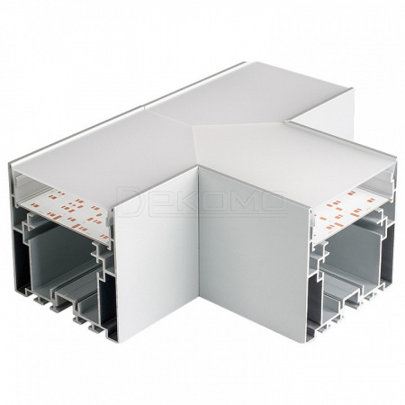 Тройной угол в сборе, для соединения 3-х профилей S2-LINE-7977 под прямыми углами 90°. Экран образует линию "Т" на плоскости. В комплекте матовый экран, площадка для ленты, соединители. Длина внешней стороны угла 200 мм.