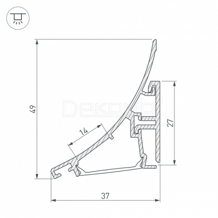 2-х компонентый алюминиевый скругленный профиль для карнизной подсветки на светодиодной ленте шириной до 14мм. В комплекте основание и накладной профиль. Может использоваться с матовым или прозрачным экраном (рассеивателем), заглушками, соединителями. Размер 2000х37х49мм.