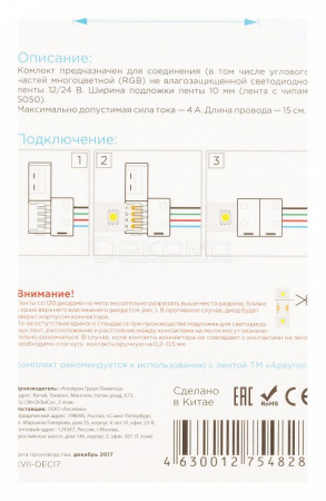 Набор коннекторов 09-12 для светодиодной RGB ленты с шириной подложки 10 мм служит прекрасной альтернативой в тех случаях, когда нет возможности паять. Чаще всего подложку шириной 10 мм можно встретить у RGB ленты со светодиодами 5050, 5060. С помощью коннектора можно соединить 2 отрезка светодиодной ленты. В комплект входит 2 провода, на которых с двух сторон размещены зажимы для светодиодной ленты.