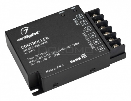 Контроллер для светодиодной RGB ленты (ШИМ). Питание/рабочее напряжение 12-24VDC, максимальный ток 10A на канал, 3 канала, максимальная мощность 360-720W. Винтовые клеммы. Корпус - PVC. Габариты 110x75x25 мм. Управляется пультами и панелями серии SMART (поставляются отдельно).