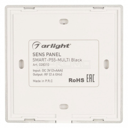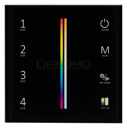 Накладная сенсорная панель 2.4 ГГц, цвет чёрный. Материал - стекло. Для управления RGB+MIX (5-канальными) источниками света (ШИМ), 4 зоны управления. Питание/рабочее напряжение 3VDC от 2xAAA. Габариты 86х86х21 мм. Панель совместима с контроллерами серии SMART.