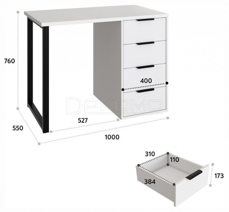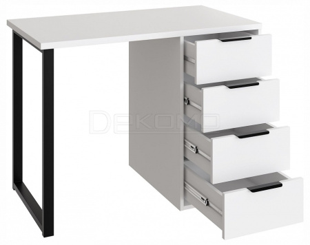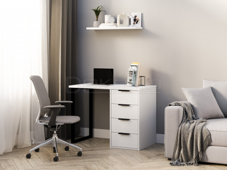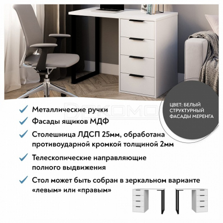Стол письменный С-404 позволит создать комфортное и стильное рабочее пространство в офисе или домашнем кабинете. Стол С-404 можно использовать в качестве маникюрного стола. Стол имеет прочную стальную опору и тумбу с четырьмя выдвижными ящиками. Столешница изготовлена из ЛДСП 25 мм, фасады МДФ 16 мм. Дно ящика двп 3 мм. Стол может быть собран в зеркальном варианте «правым» или «левым». Фурнитура: телескопические направляющие полного выдвижения без доводчиков, ручки и опора металл.