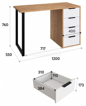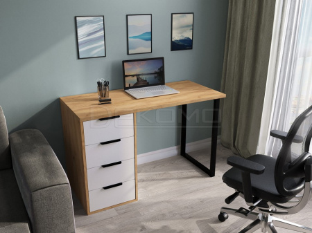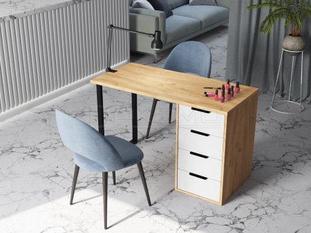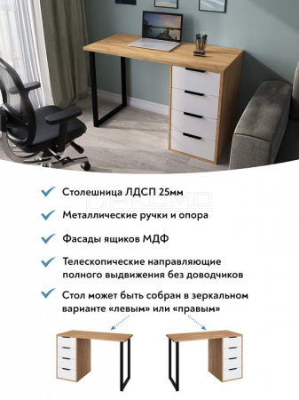 Стол имеет прочную стальную опору и тумбу с четырьмя выдвижными ящиками. Столешница изготовлена из ЛДСП 25 мм.