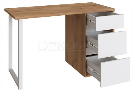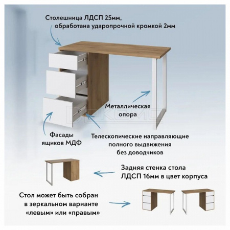 Стол письменный С-411 - это идеальное решение как для большого пространства, так и для небольшой комнаты. Стол прямой обеспечивает максимальную вместительность и удобство использования. Стол оснащен стильной металлической опорой. Три выдвижные ящика - вместительны и комфортны в расположении. Не нужно никуда вставать, за важными документами или вещами, достаточно расположить все рядом с собой! Стол может быть собран в зеркальном варианте «правым» или «левым». Столешница изготовлена из ЛДСП 25 мм, фасады МДФ 16 мм. Дно ящика ДВП 3 мм. Фурнитура: телескопические направляющие полного выдвижения без доводчиков, опора металл.