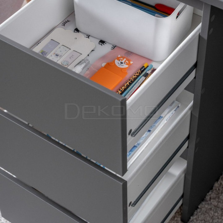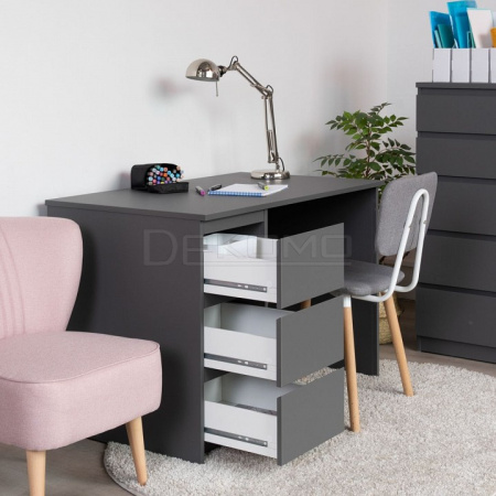 Стол письменный КАСТОР с тремя наружными выдвижными ящиками, 1510х650х750, цвет Серый. Изготовлен из кашированного ДСП толщиной 16 мм. Тумбу с ящиком можно разместить справа или слева под столешницей. Гарантийный срок для жилых помещений 24 месяца, для общественных помещений - 18 месяцев.