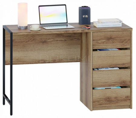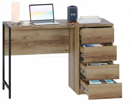 Стильный письменный стол СПМ-405 идеально подходит для организации полноценного рабочего места, эффективно задействуя пространство в доме или офисе. За счет интересного решения с металлическими опорами на регулируемых подпятниках и столешницы толщиной 22 мм с противоударной кромкой создается современная обстановка в стиле лофт. Модель оснащена вместительной тумбой с четырьмя ящиками, а также столешницей шириной 1130 мм и глубиной 449 мм для удобного хранения всей необходимой канцелярии и документов. Ящики с надежными шариковыми направляющими обеспечивают плавное бесшумное открывание, а вместо привычных ручек сделаны стильные вырезы между фасадами.