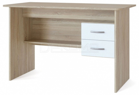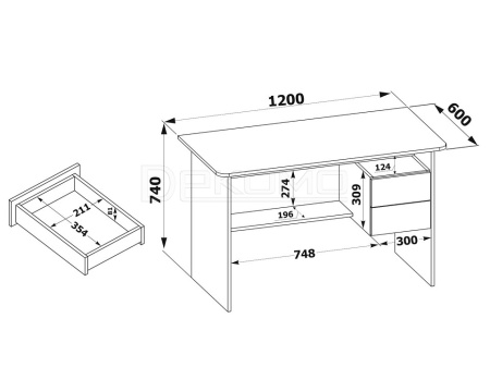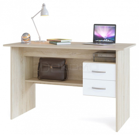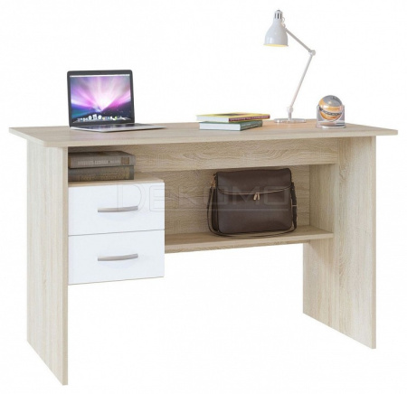 Большой письменный стол со встроенной тумбой. Внизу задней стенки также находится небольшая полочка. Встроенная тумбы состоит из двух ящиков с открытой нишей сверху. За таким столом удобно будет себя чувствовать и школьник и студент. Стол также можно использовать как компьютерный.