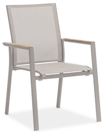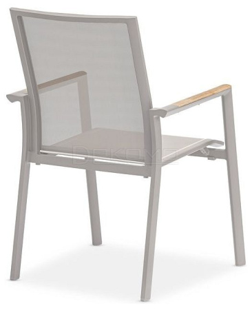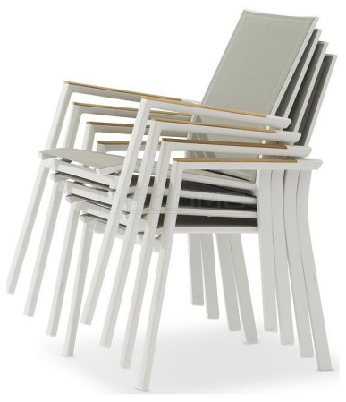 Современная коллекция, состоящая из штабелируемых стульев и лежаков. Каждая деталь имеет современную эстетику, стильные детали на ножках и рамах, а также превосходный комфорт для сидения. Тиковые подлокотники.
