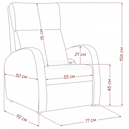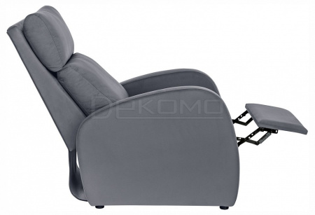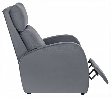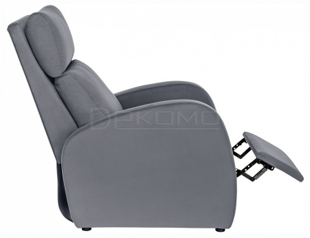 Кресло очень мягкое, комфортное и приятное тактильно. Спинка откидывается назад и может принимать 3 различных положения, независимо от сиденья. Кресло оснащено выдвижной полкой. Она обита мягким наполнителем, велюровой тканью и предназначается для отдыха ног.