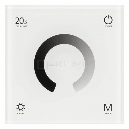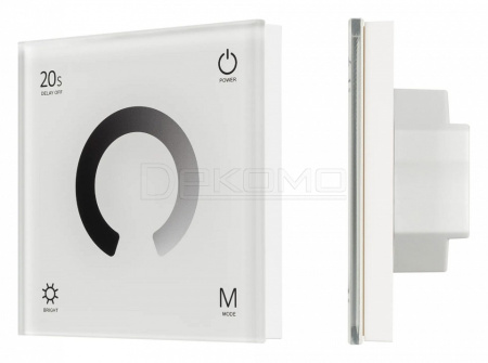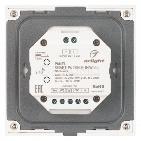 Встраиваемая сенсорная стеклянная панель 2.4 ГГц, цвет белый. Для управления одноцветными источниками света (ШИМ). Управление яркостью с помощью сенсорного кольца. Работает в режиме master/slave и может выполнять функцию независимого контроллера. Питание/рабочее напряжение 12-24VDC, 4 параллельных канала по 3А максимальной нагрузки на канал, максимальная суммарная мощность 144-288W. Габариты 86х86х33 мм. Панель совместима с диммерами серии SMART. Возможно управление пультами (см. совместимые товары) или другими панелями.