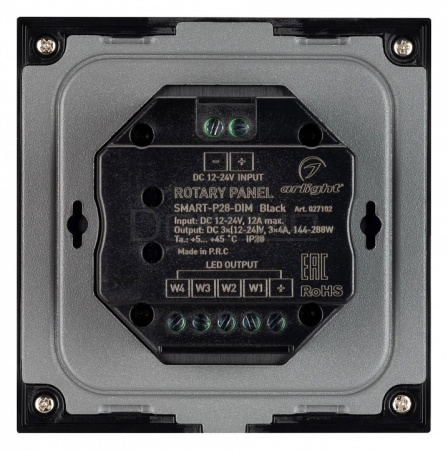 Встраиваемая роторная стеклянная панель 2.4 ГГц, цвет чёрный. Для управления одноцветными источниками света (ШИМ). Управление яркостью с помощью роторного регулятора. Работает в режиме master/slave и может выполнять функцию независимого контроллера. Питание/рабочее напряжение 12-24VDC, 4 параллельных выхода по 4А максимальной нагрузки на канал, максимальная суммарная мощность 144-288W. Габариты 86х86х50 мм. Панель совместима с диммерами серии SMART. Возможно управление пультами (см. совместимые товары) или другими панелями.