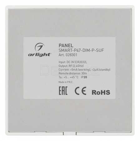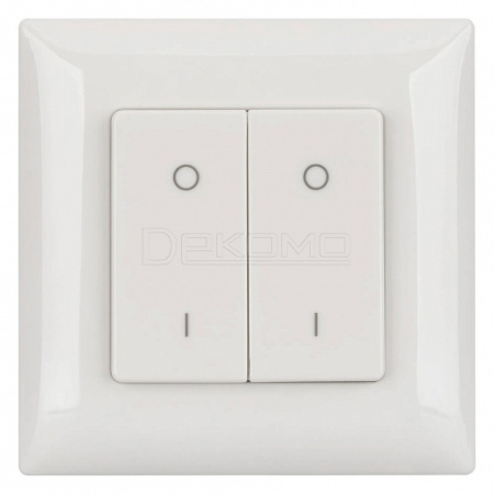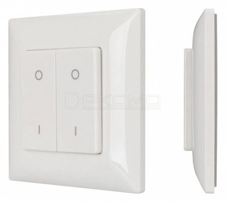 Накладная кнопочная панель 2.4 ГГц, цвет белый. Материал - пластик. Для управления одноцветными источниками света (ШИМ), 2 зоны управления. Питание/рабочее напряжение 3VDC от батарейки CR2032. Габариты 86х86х15 мм. Панель совместима с диммерами серии SMART.