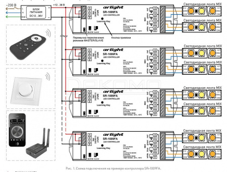 Привязка неограниченного управления от дистанционного пульта, настенных панелей и мобильных устройств на базе платформ iOS и Android (при использавании специализированного конвертера Wi-Fi SR-2818WITR и приложений EasyColor, RealColor или EasyLighting).