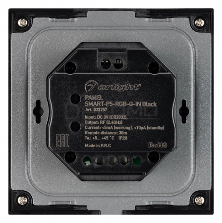 Встраиваемая роторная панель 2.4 ГГц, цвет чёрный. Материал - стекло/пластик. Для управления RGB источниками света (ШИМ). Управление яркостью с помощью роторного вращателя. Питание/рабочее напряжение 3VDC от батарейки CR2032. Габариты 86х86х48 мм. Предназначена для установки в стандартный подрозетник. Панель совместима с контроллерами серии SMART.