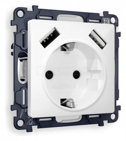 Розетка с заземлением и со шторкой и 2хUSB type A, без рамки ALFA MA109010