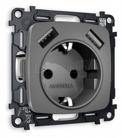 Розетка с заземлением и 2хUSB type A, без рамки OMEGA MO659010
