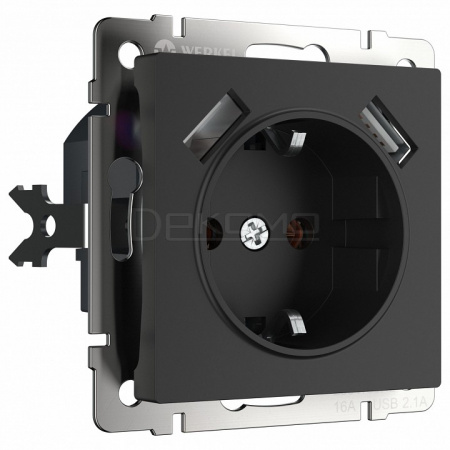 Розетка с заземлением и со шторками и 2хUSB, без рамки черный матовый W1171508