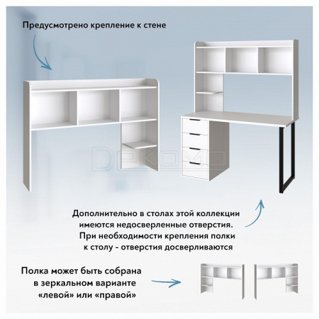 Дополнительно в столах этой коллекции имеются недосверленные отверстия (С-402, С-406, С-407, С-412, С-416). При необходимости крепления надстройки к столу - отверстия досверливаются.