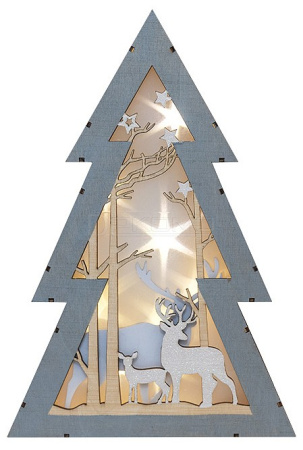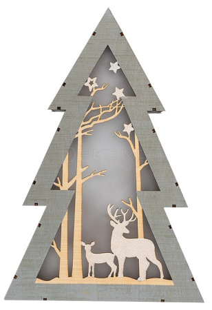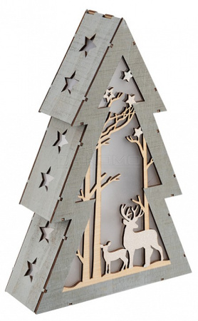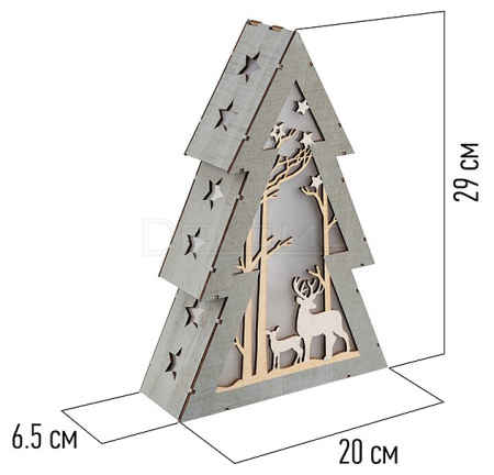 Деревянная фигурка с подсветкой «Елочка» 20×6,5×29 см — необычное светодиодное украшение, выполненное в виде елочки с многослойной композицией: на фоне резных деревьев расположены фигуры оленей, подсвечиваемые 8 диодами. Теплый белый свет создает ощущение зимней сказки, в которую вам непременно захочется окунуться. В нижней части изделия находится батарейный блок для двух элементов питания типа ААА и кнопка ON/OFF. Интерьерный декор из экологичного дерева станет прекрасным подарком и любимой игрушкой ребенка.