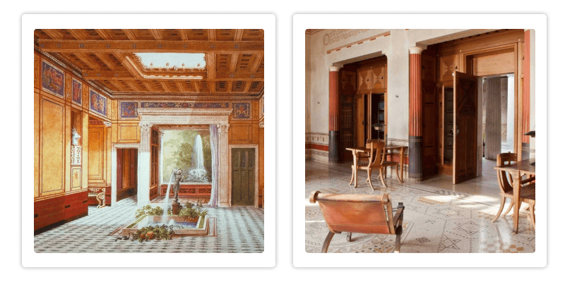 Славился своим простым, но функциональным дизайном. Интерьеры оформляли с использованием небольшого количества мебели, главными элементами которой были низкие столы, кушетки и яркие фрески. Пространства имели чётко выраженные зоны, что можно считать одним из первых примеров зонирования.