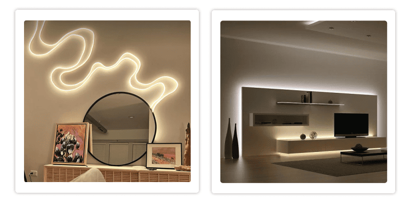 - Светодиодные ленты можно использовать для подсветки кухонных шкафов, карнизов или элементов архитектуры. Умное освещение позволяет создавать различные атмосферы в зависимости от времени суток или настроения.
