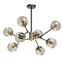 Люстра Гамбург: основание выполнено из металла и окрашено в черный цвет, а корпус, держатели плафонов и соединения на рожках гальванизированы в цвет бронзы. Светильник декорирован стеклянными плафонами сложной формы. Плафоны гальванизированы в золотистый цвет и оригинально крепятся к держателям.