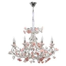 Люстра Фиеста: основание выполнено из металла и покрыто сусальным серебром. Светильник декорирован цветами ручной работы из неглазурированного фарфора розового цвета.