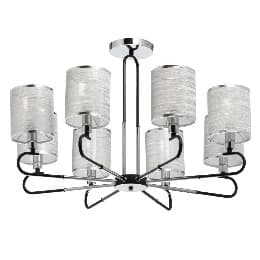Люстра Конрад: основание выполнено из металла и гальванизировано в цвет хрома. Отдельные элементы основания окрашены в черный цвет. Светильник декорирован двухслойными текстильными абажурами с термостойким акрилом внутри и жатой органзой серебряного цвета снаружи. Абажуры отделаны кантом серебряного цвета и прошиты.